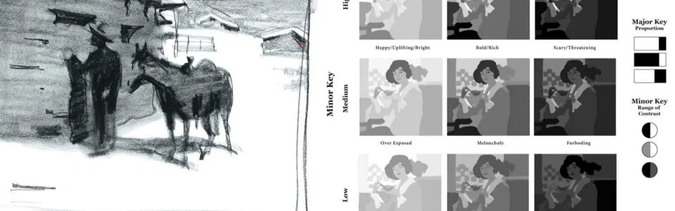 Once the shapes are established, move into value studies using the Value Matrix by Bill Perkins. Rather than drawing lines or specific objects, you are designing a pattern of light and dark. Limit your composition to a maximum of three or four tones. Organize these into specific **Value Keys**: High Key (mostly light), Mid Key (balanced), or Low Key (mostly dark).